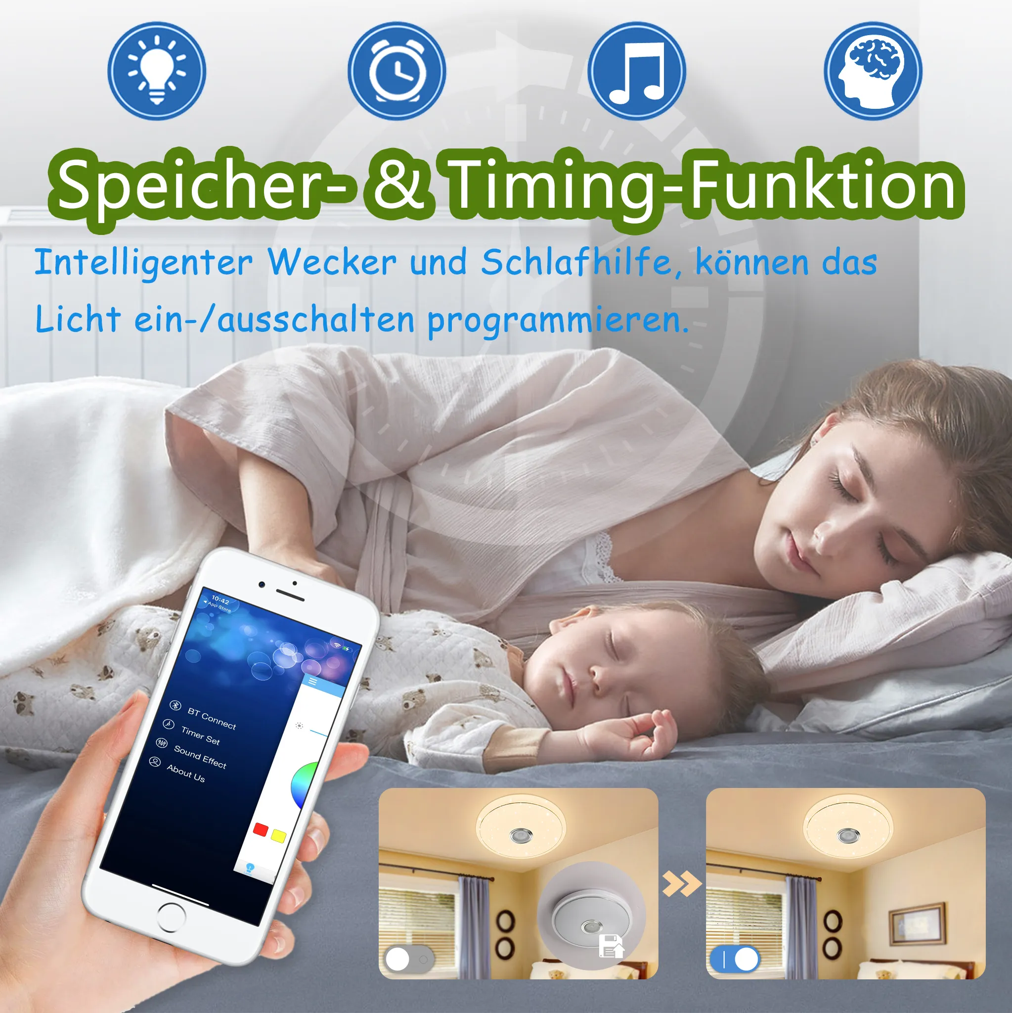 Svítidlo je osazeno nezávislým 5W Bluetooth reproduktorem, který se snadno propojí s chytrým telefonem nebo tabletem. Unikátní hudební režim umožňuje synchronizaci světelných efektů s rytmem přehrávaných skladeb, čímž v místnosti vytvoří dynamickou atmosféru vhodnou pro oslavy, tanec nebo relaxační cvičení jógy. V aplikaci lze navíc vybírat z různých zvukových profilů, jako je pop, jazz nebo klasika.
