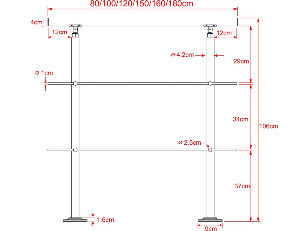 Zábradlí je vyrobeno z nerezové oceli typu 201. Tato volba materiálu zaručuje vysokou odolnost a dlouhou životnost bez stop koroze i v náročných venkovních podmínkách. Celková výška konstrukce činí 106 cm, přičemž hlavní madlo i sloupky mají průměr 42 mm pro pohodlný a bezpečný úchop. Lesklý povrch dodává celému prvku moderní a vysoce estetický vzhled.