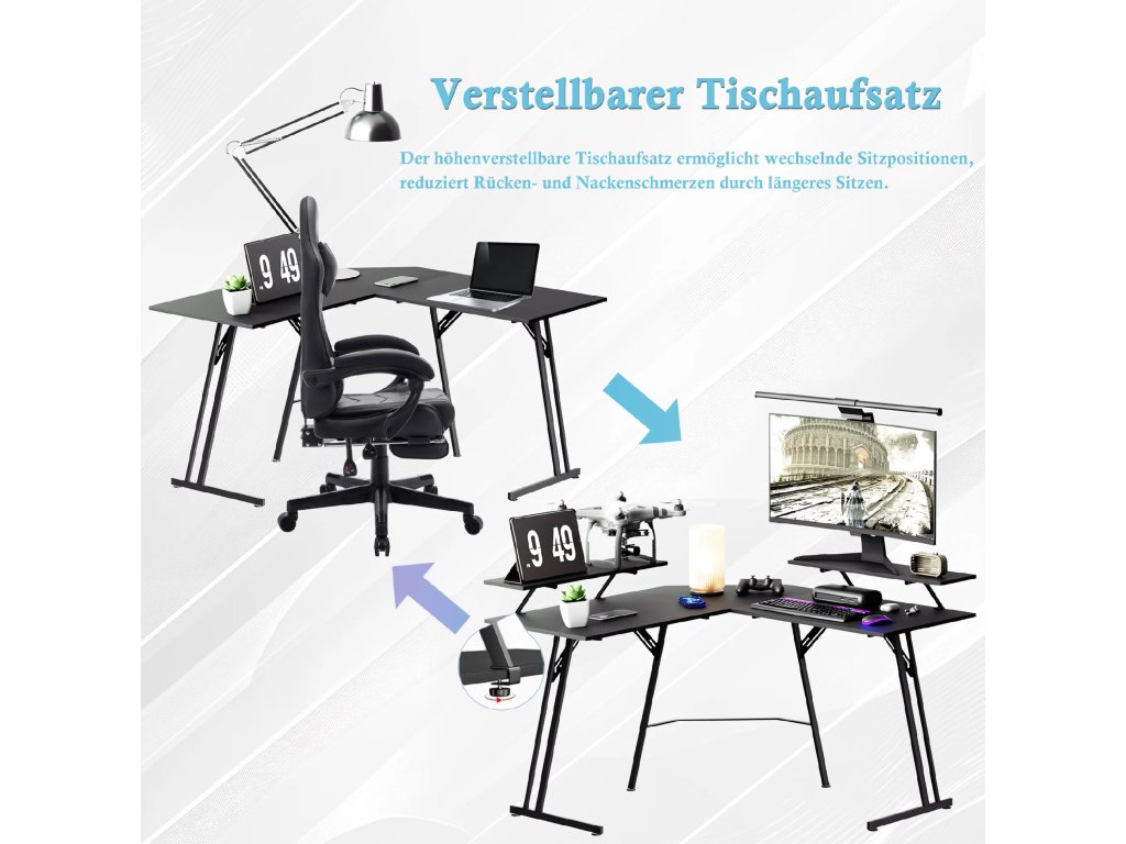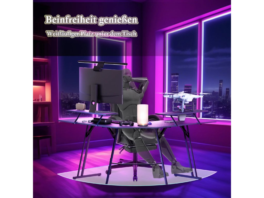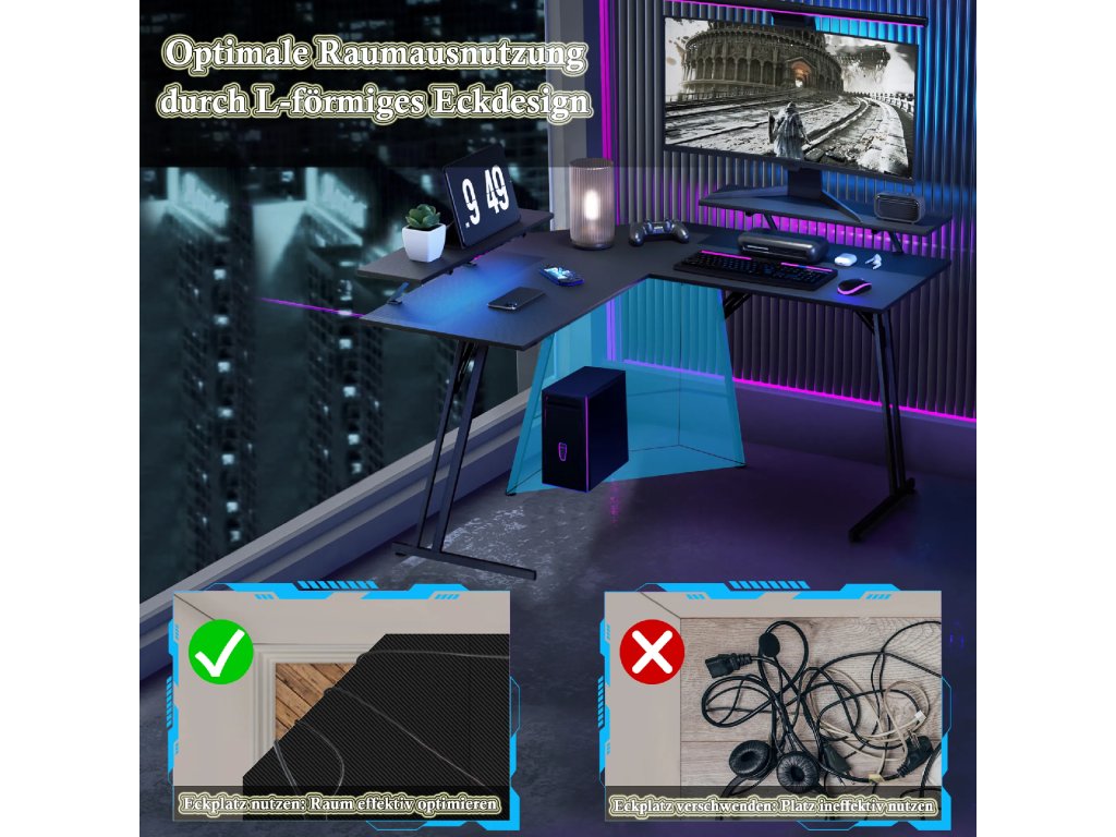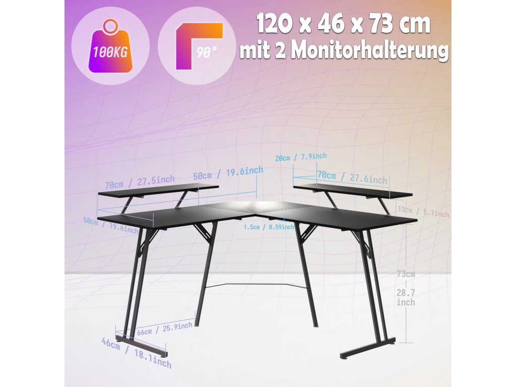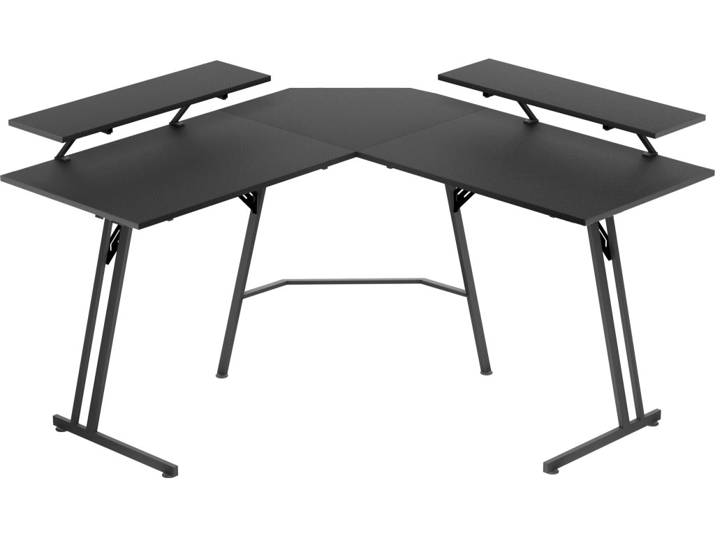 Konstrukce ve tvaru písmene L efektivně vyplňuje rohy místnosti a vytváří rozsáhlé místo pro počítač i veškeré příslušenství. Hlavní deska o rozměrech 120 x 50 cm poskytuje uživateli dostatek prostoru pro nohy a volný pohyb. Tento specifický tvar umožňuje mít veškeré vybavení přehledně uspořádané na dosah ruky.