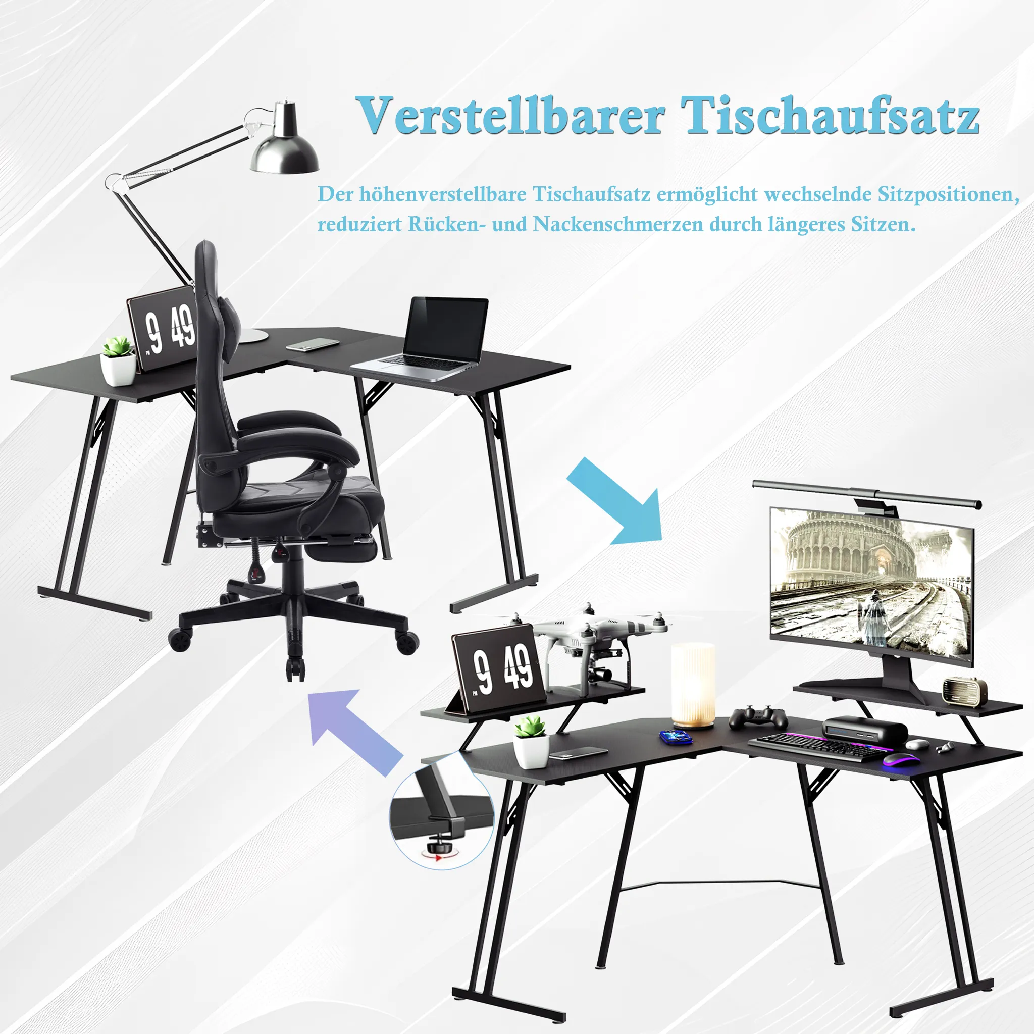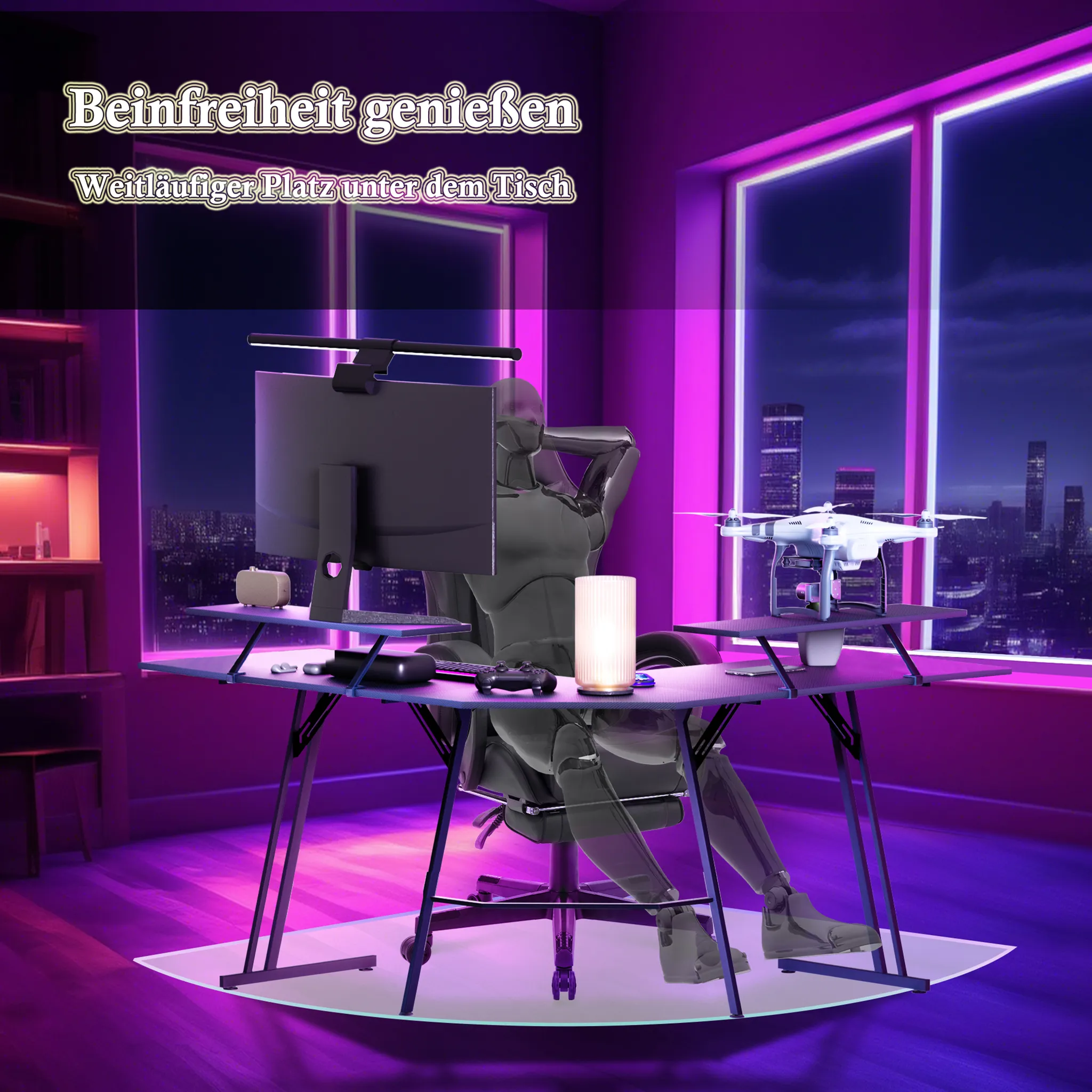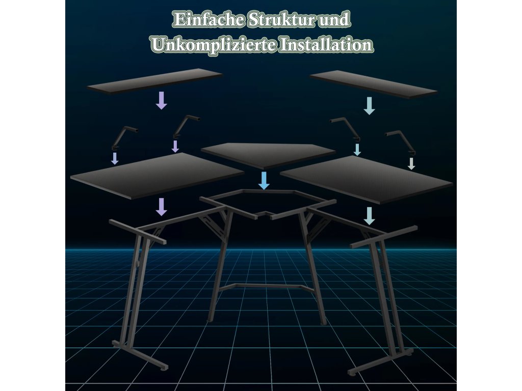 Konstrukce ve tvaru písmene L efektivně vyplňuje rohy místnosti a vytváří rozsáhlé místo pro počítač i veškeré příslušenství. Hlavní deska o rozměrech 120 x 50 cm poskytuje uživateli dostatek prostoru pro nohy a volný pohyb. Tento specifický tvar umožňuje mít veškeré vybavení přehledně uspořádané na dosah ruky.