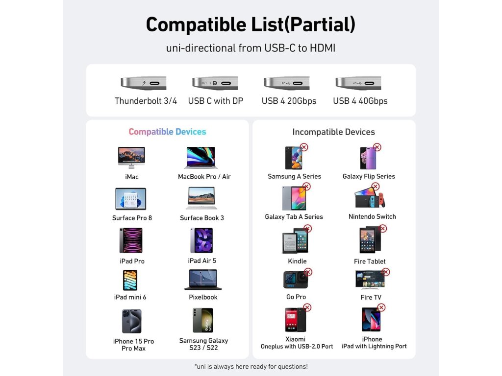 Kabel funguje na principu Plug-&-Play, tzn. okamžitě a bez nutnosti instalace jakéhokoli softwaru nebo ovladačů. USB-C port vašeho zařízení se tak okamžitě promění v HDMI port. Je kompatibilní s technologiemi Thunderbolt 4 a Thunderbolt 3. Mezi podporovaná zařízení patří mimo jiné MacBook Pro (od roku 2016), iPhone 15 Series, iPad Pro, Surface Book 3/2 a modely Galaxy S22/S21/S20 a Samsung Tablet S9/S8/S7. (Poznámka: U modelů iPad Pro, které podporují pouze protokol DisplayPort, je maximální rozlišení na HDMI 2K při 60 Hz a není podporováno zobrazení na celou obrazovku).