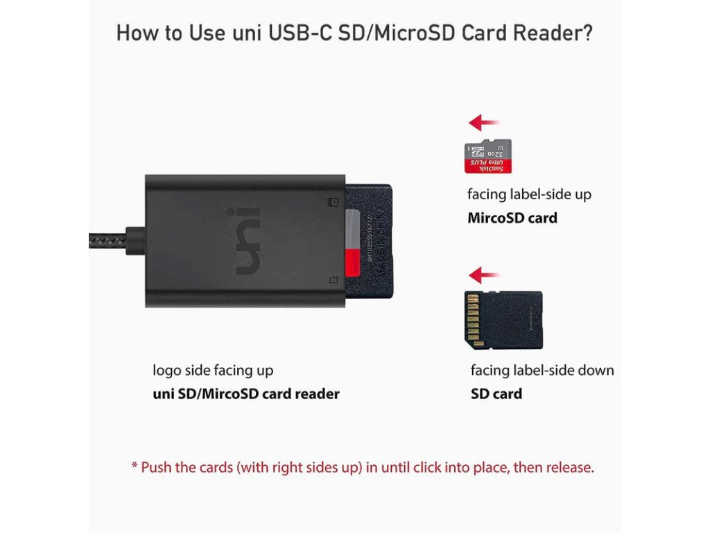 Čtečka je vybavena několika promyšlenými funkcemi pro maximální uživatelský komfort. Pružinový mechanismus zajišťuje, že vkládání a vyjímání karet je hladké a bezproblémové. Označení směru vložení karty eliminuje chyby a nutnost opakovaného pokusování. Porty jsou uspořádány tak, aby neblokovaly ostatní porty na vašem zařízení, což zajišťuje snadný přístup k sousedním připojením.