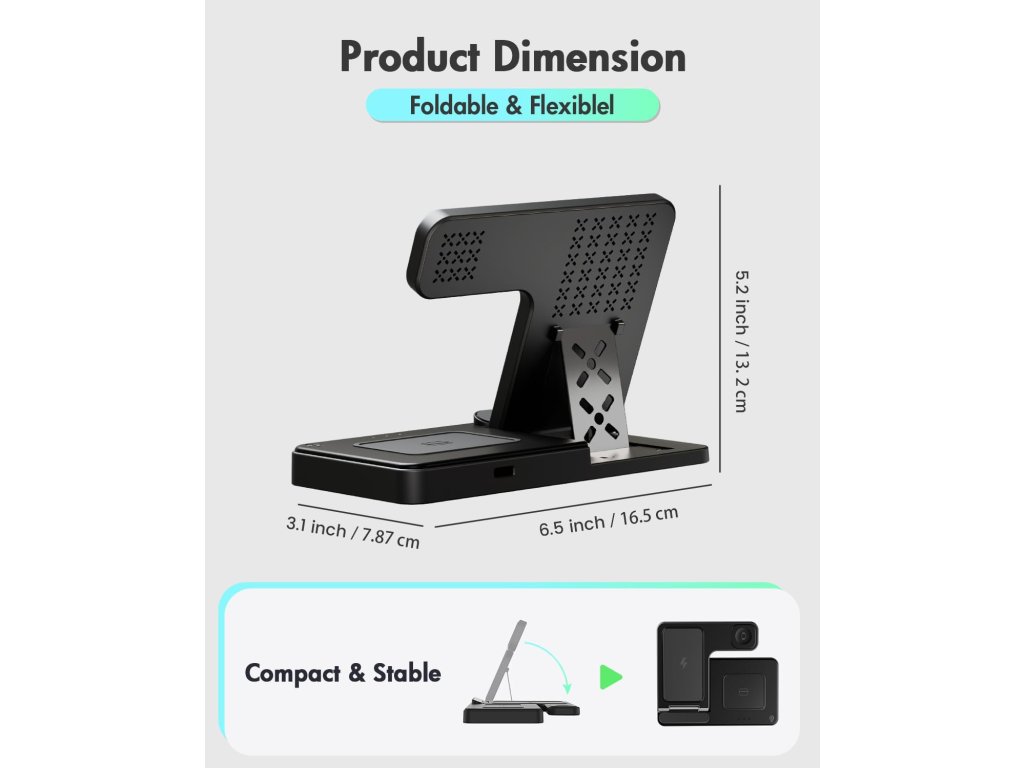 Díky promyšlenému skládacímu mechanismu je nabíječka velmi skladná a snadno přenosná. Ideálně poslouží nejen v domácnosti či kanceláři, ale také na cestách, kde v zavazadle nezabere téměř žádné místo. Protiskluzová povrchová úprava navíc zajišťuje vysokou stabilitu stanice i vložených přístrojů na hladkém povrchu.