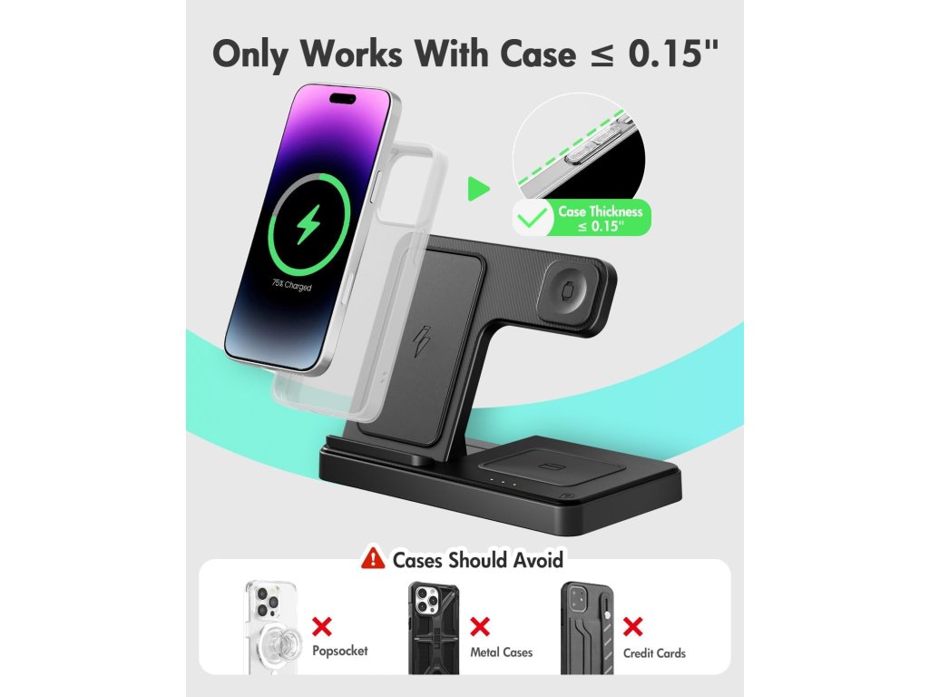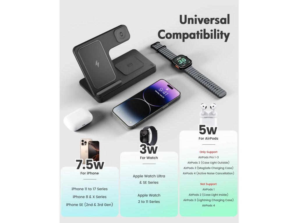 Hlavní předností tohoto modelu je jeho univerzálnost. Zařízení spolehlivě spolupracuje nejen s produkty Apple, ale i s elektronikou dalších významných výrobců, kteří podporují standard bezdrátového nabíjení. Pohodlně zde doplníte energii telefonům s podporou Qi, bezdrátovým sluchátkům a kompatibilním chytrým hodinkám bez ohledu na konkrétní značku.