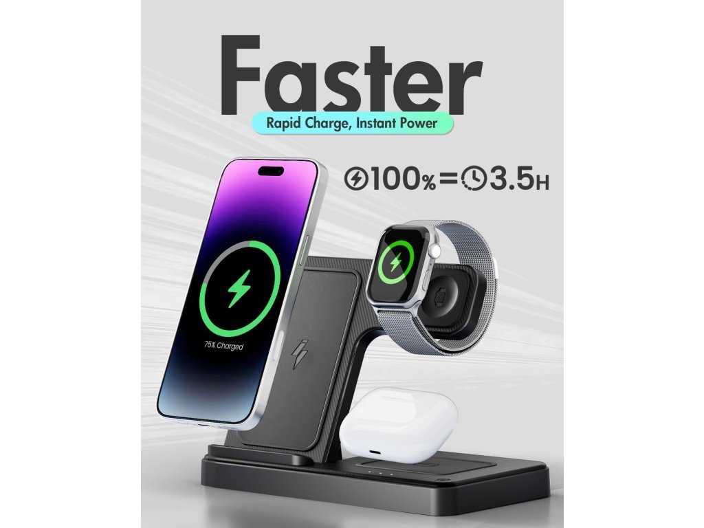 Univerzální bezdrátová nabíjecí stanice 3v1, skládací, černá