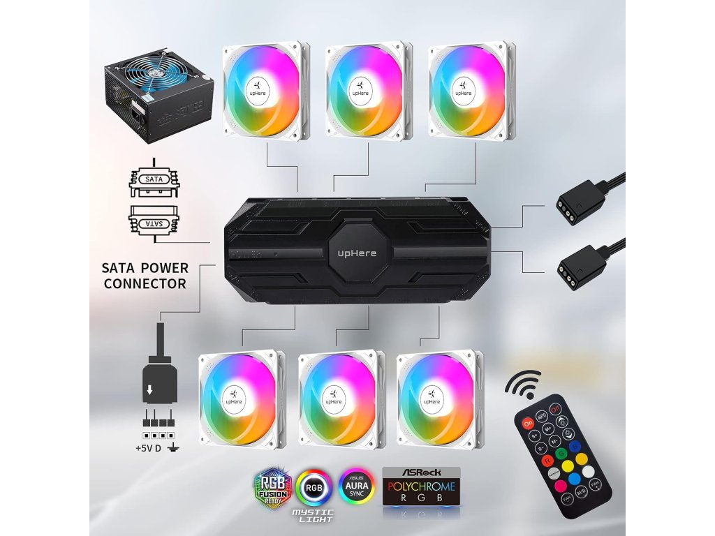 Bezdrátový RF dálkový ovladač je klíčovým prvkem pro snadnou obsluhu, umožňující jednoduchým stisknutím tlačítka upravit rychlost ventilátorů (Nízká/Střední/Vysoká), světelné efekty, jas a rychlost LED. Kromě dálkového ovládání je k dispozici synchronizovatelné RGB osvětlení s kompatibilními základními deskami s 5V adresovatelným RGB konektorem, podpora softwaru zahrnuje Aura Sync, Gigabyte RGB FUSION a MSI Mystic Light Sync.