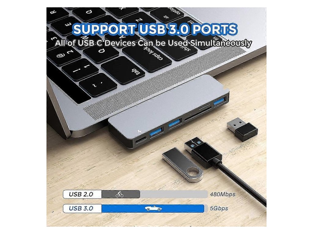 Hub disponuje třemi porty USB 3.0, které umožňují super rychlý přenos dat s rychlostí až 5 Gbps. Snadno připojíte smartphony, tablety, externí disky, klávesnici nebo myš. Přenos velkých souborů probíhá velmi rychle, usnadňuje tak práci s daty a zálohování.