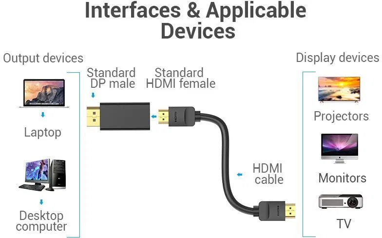 Vention adaptér má na jedné straně DisplayPort konektor typu male (samec), určený pro připojení ke zdroji signálu (např.