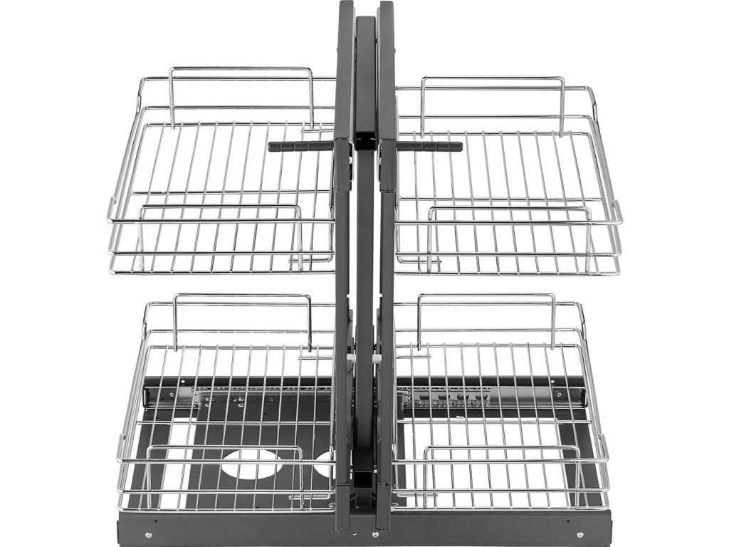 Systém je navržen speciálně pro takzvané slepé rohy kuchyňských linek. Čtyři velkokapacitní koše o rozměrech 420 x 265 x 90 mm umožňují přehlednou kategorizaci kuchyňského náčiní. Vytažení košů probíhá plynule po kvalitních kolejnicích bez zasekávání, a to i při plném zatížení těžkými hrnci nebo velkými talíři.