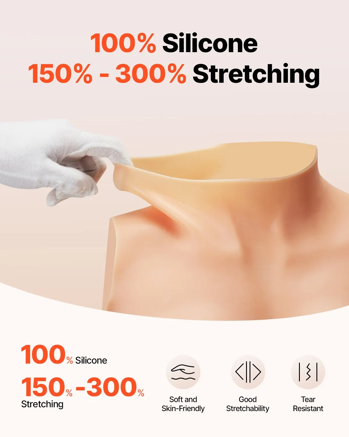 Použitý 100% silikon vyniká extrémní roztažitelností v rozmezí 150–300 % původní velikosti, což usnadňuje oblékání a minimalizuje riziko roztržení. Produkt je vhodný pro postavy s výškou 155–180 cm a hmotností 55–75 kg. Součástí balení jsou navíc rukavice a labutěnka, které zajišťují ještě pohodlnější a hladší nasazování náprsníku bez poškození materiálu.