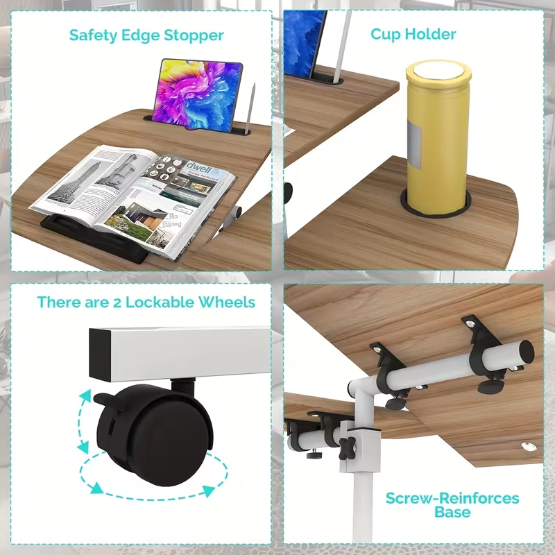 Světle hnědá dřevěná deska dodává stolu elegantní vzhled vhodný do každé domácnosti či kanceláře. Pro maximální uživatelský komfort je pracovní plocha vybavena integrovaným držákem na nápoje a speciálními sloty pro bezpečné odložení mobilního telefonu nebo tabletu.