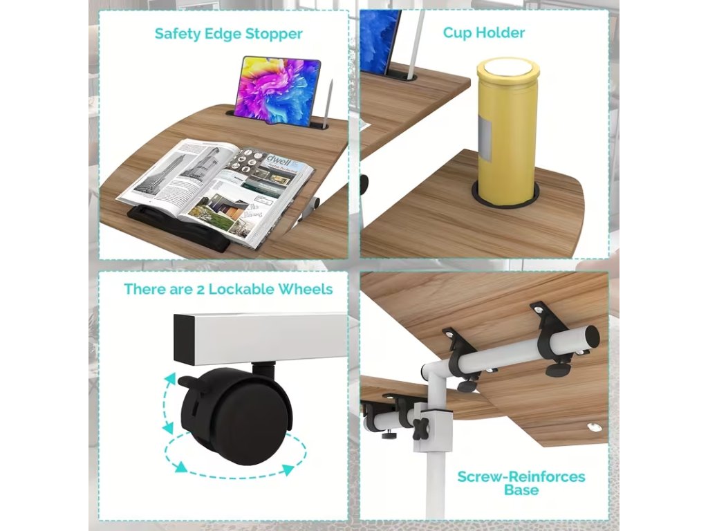 Světle hnědá dřevěná deska dodává stolu elegantní vzhled vhodný do každé domácnosti či kanceláře. Pro maximální uživatelský komfort je pracovní plocha vybavena integrovaným držákem na nápoje a speciálními sloty pro bezpečné odložení mobilního telefonu nebo tabletu.