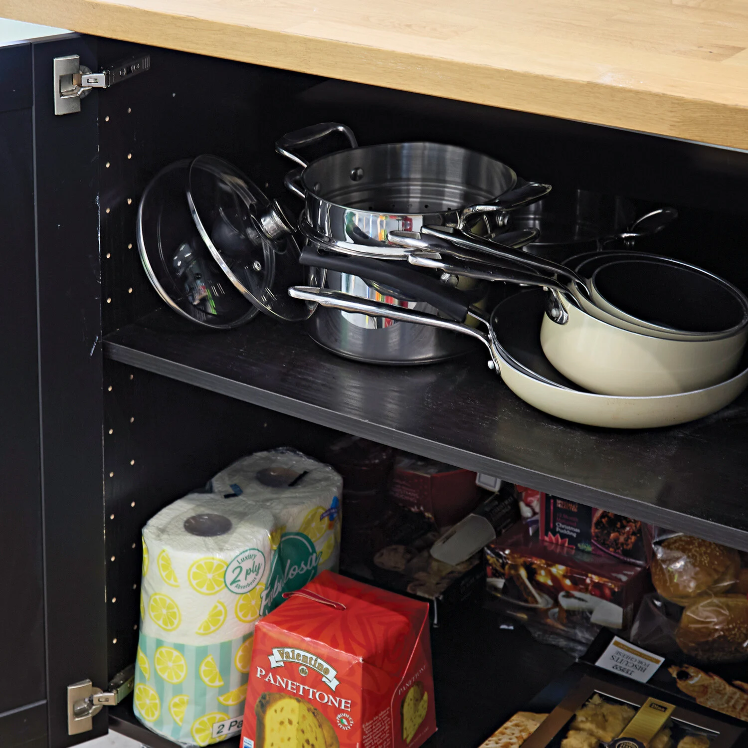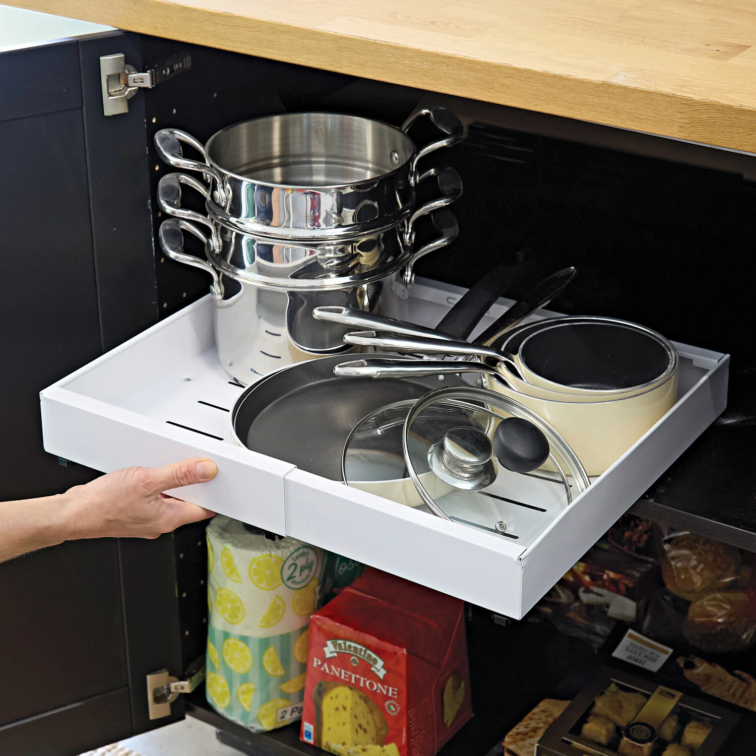 Největší předností této přihrádky je její nastavitelná šířka v rozmezí od 31,5 do 51,5 cm. Díky tomu se dokonale přizpůsobí různým rozměrům nábytku. Pokud máte extra široké skříně, můžete umístit několik přihrádek vedle sebe a využít tak úložný prostor na maximum bez kompromisů.