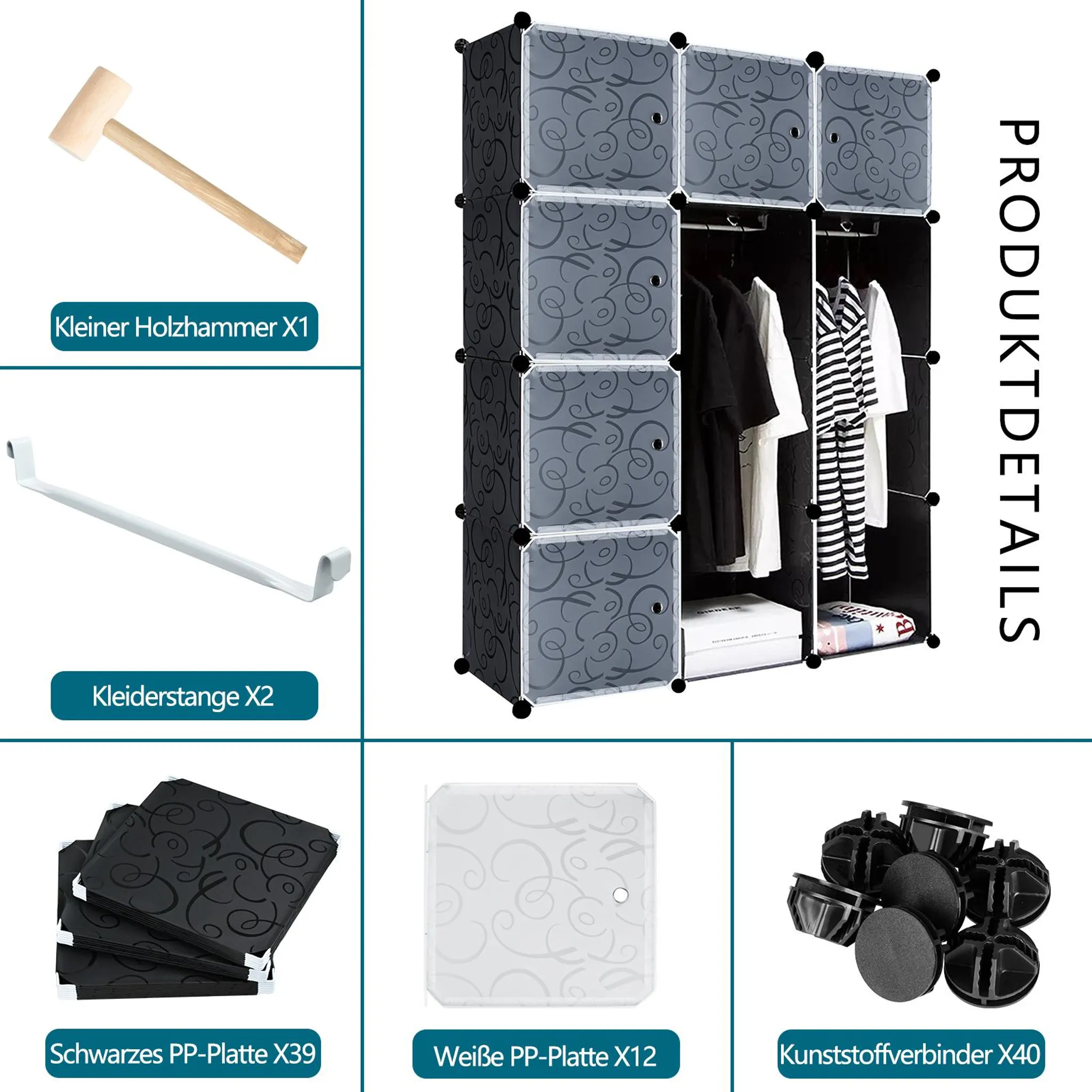 Sada obsahuje dvanáct dvířek vybavených magnety pro bezpečné uzavření a ochranu obsahu před nečistotami. Součástí balení jsou také dvě závěsné tyče na ramínka pro pohodlné zavěšení svršků. Celý proces instalace usnadňuje přiložené dřevěné kladívko, s nímž je spojování jednotlivých dílů mnohem jednodušší než montáž běžného dřevěného nábytku