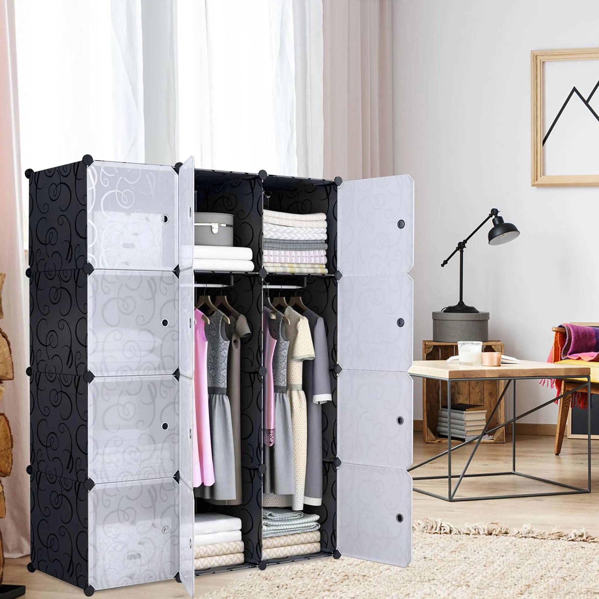 Hlavní předností tohoto regálu je jeho modulární povaha umožňující sestavení do libovolného tvaru. Skříň snadno přizpůsobíte dispozicím ložnice, obývacího pokoje nebo šatny podle vašich aktuálních prostorových možností. Kreativní systém dovoluje vytvářet různé styly uspořádání pro uložení oblečení, bot, hraček i módních doplňků.
