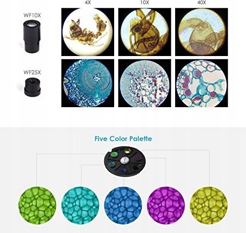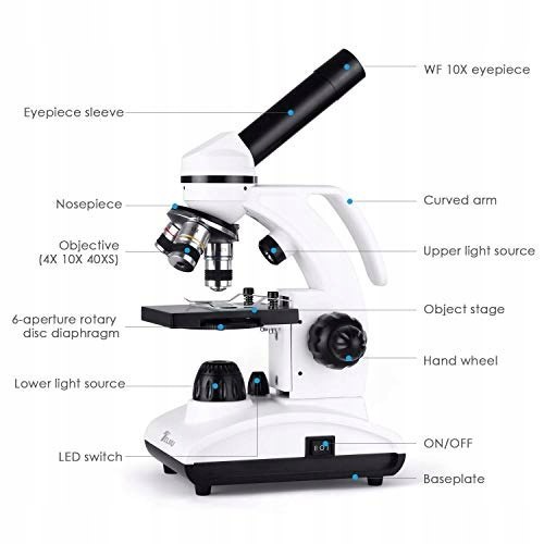 Mikroskop nabízí tři úrovně zvětšení: X40, X100 a X400. Tyto možnosti umožňují přizpůsobit obraz druhu pozorovaného vzorku a objevovat stále nové detaily mikro světa, od listů po drobné organismy.