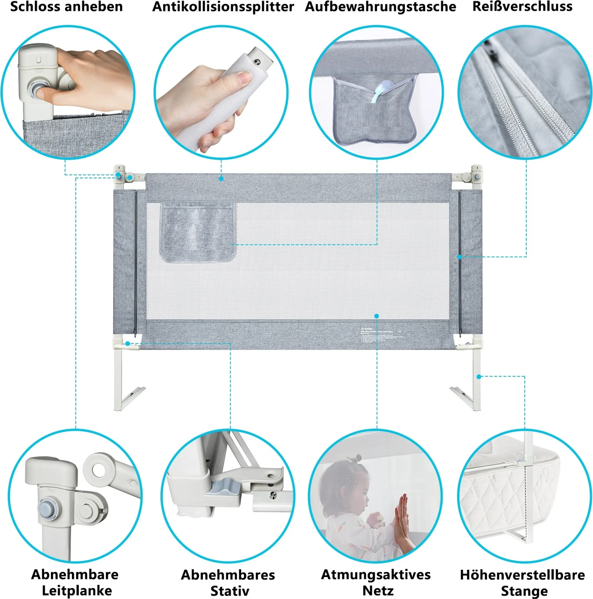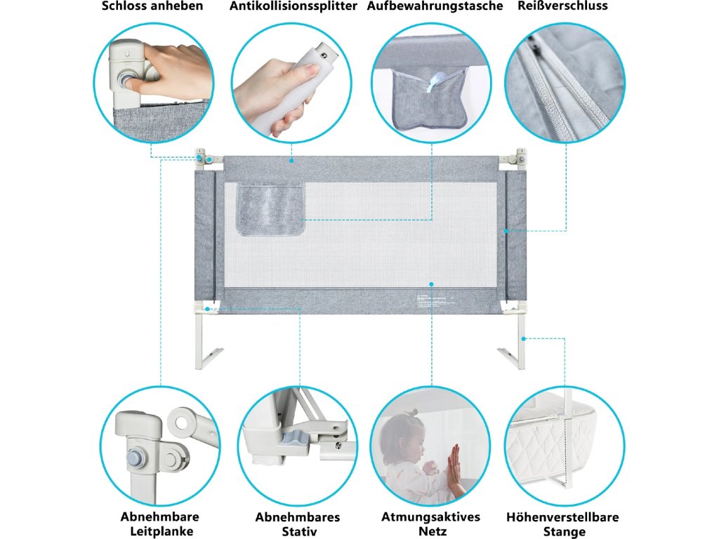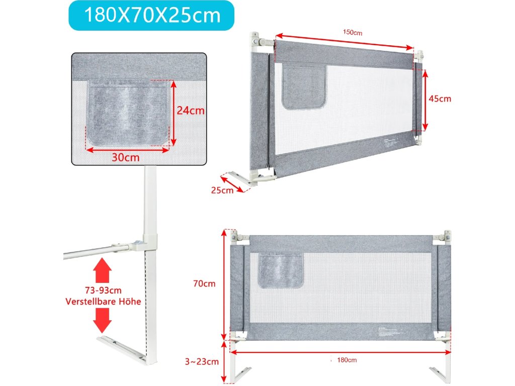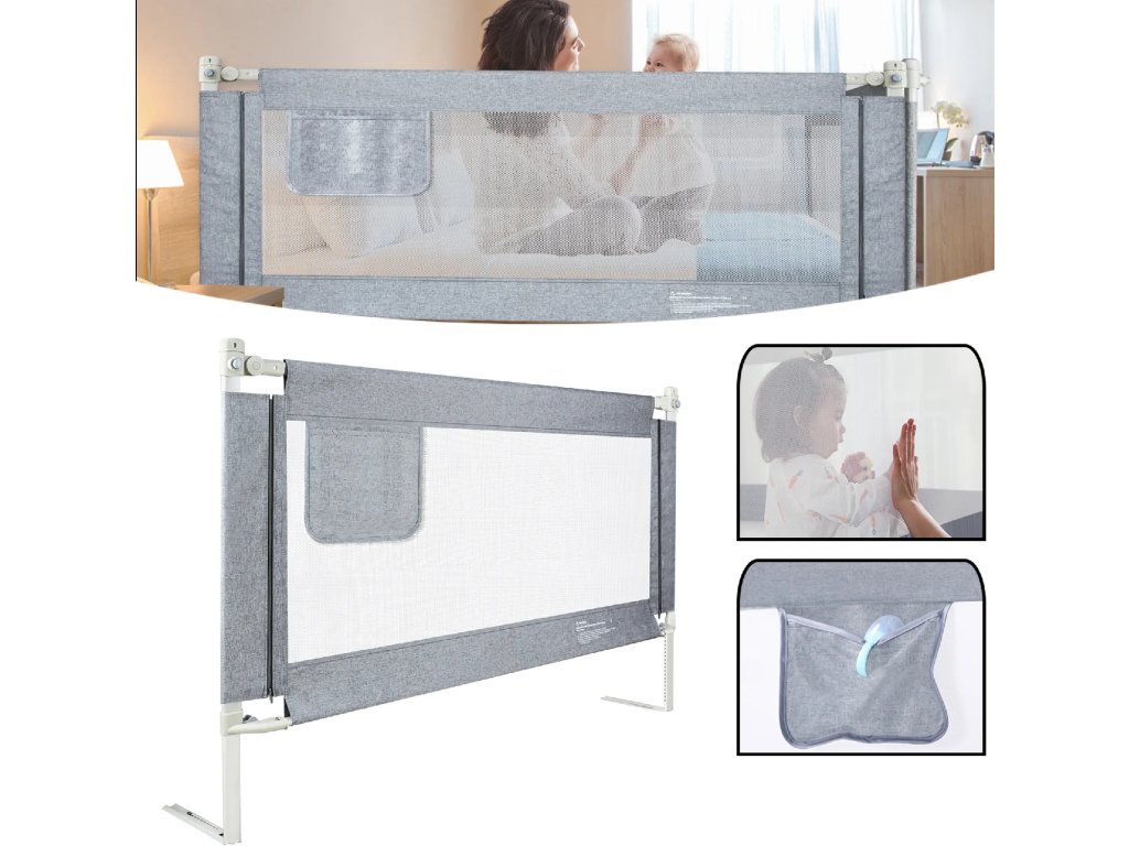 YARDIN Dětská zábrana na postel, 180 cm, nastavitelná výška, šedá