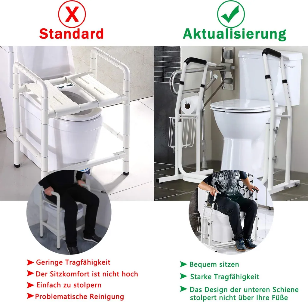 Tato pomůcka nabízí možnost výškového nastavení v 5 stupních v rozmezí od 68 do 78 cm. Také vzdálenost mezi područkami lze upravit podle postavy uživatele. Velkou výhodou je bezděrová instalace, která nevyžaduje žádné vrtání do podlahy či stěn. To usnadňuje umístění rámu nejen k toaletě, ale také k umyvadlu nebo sprchovému sedátku.