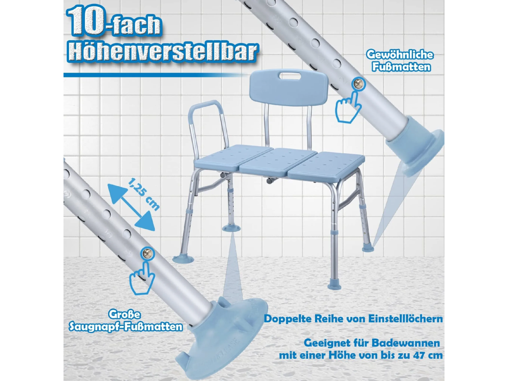 Uživatelé mají k dispozici desetistupňové nastavení výšky sedadla v rozsahu od 47 do 58,5 cm, kde každý stupeň představuje rozdíl přibližně 1,25 cm. Třídílné sedadlo o rozměrech 67 na 41 cm má protiskluzový povrch a praktické otvory pro odtok vody. Odnímatelné opěradlo a měkké pěnové područky zvyšují celkový komfort během hygieny. Židli lze použít i ve vaně s výškou stěny do 47 cm.