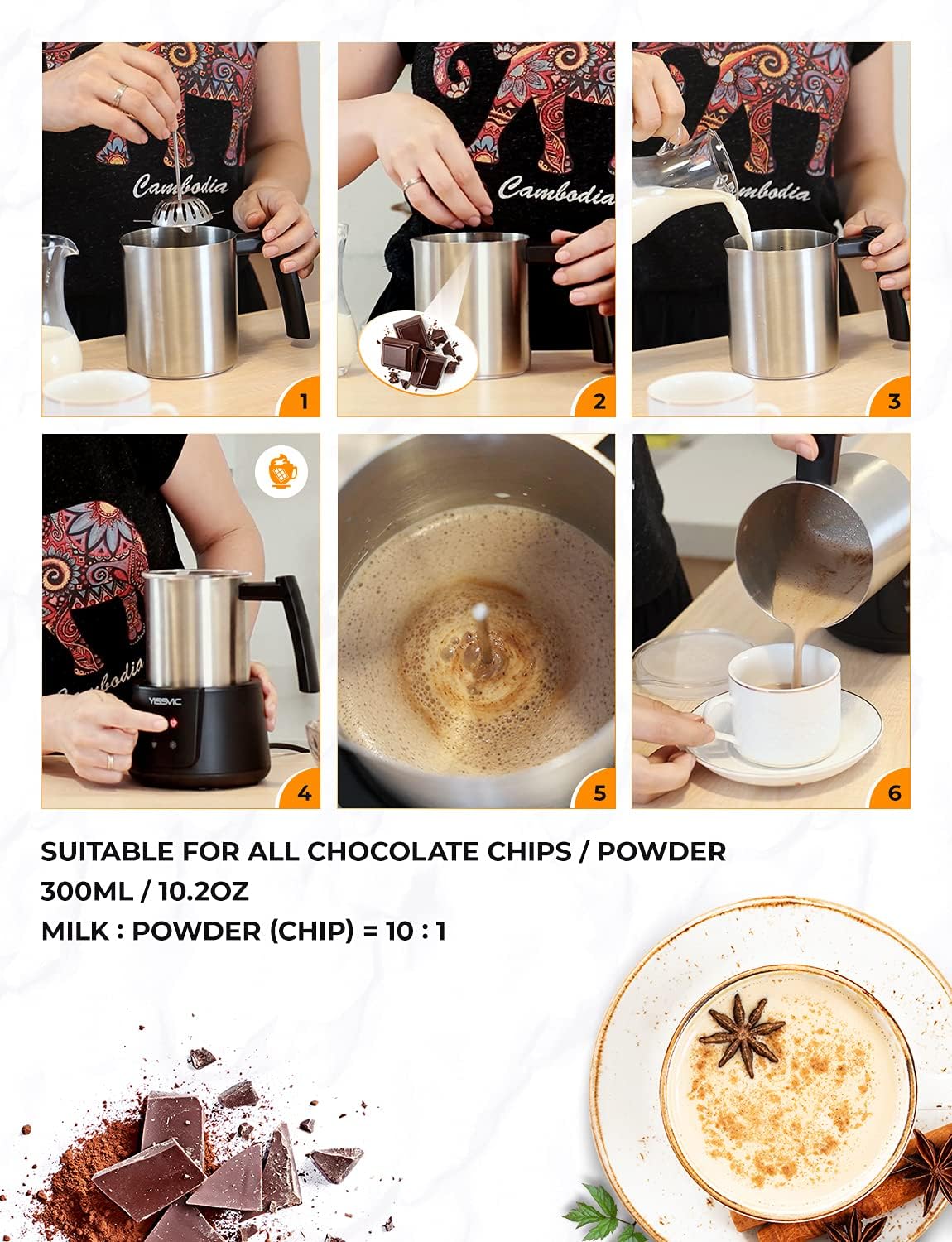 Napěňovač mléka je perfektní pro ty, kteří milují horkou čokoládu. Přístroj umožňuje přidat práškovou čokoládu nebo čokoládové fazole přímo do mléka (doporučený poměr mléka a čokolády je 10:1), po čemž stačí stisknout tlačítko „Horká čokoláda“ a počkat 2–3 minuty, než se vytvoří lahodná šálek. Tento jednoduchý a rychlý proces vám umožní vychutnat si bohatou čokoládovou chuť kdykoliv máte chuť. S touto funkcí je napěňovač mléka ideální pro chladné zimní večery nebo speciální chvíle.
