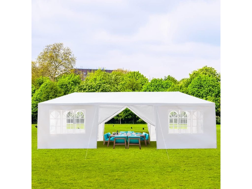 Zahradní párty stan 3x9 m s 8 bočnicemi, voděodolný, bílý, nový